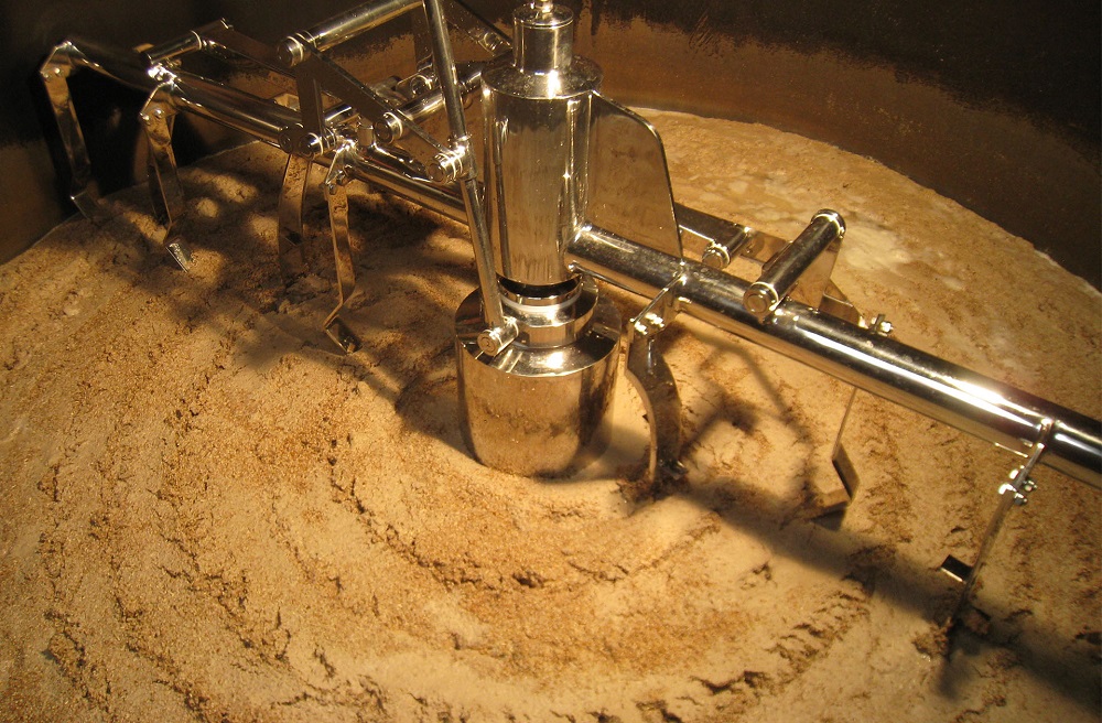 過濾罐中配備的耕刀裝置主要作用是用于疏松糟層,根據過濾壓差來上下升降,不是用來攪拌的。耕刀在過濾槽中轉動的速度很慢,十幾分鐘一圈。醪液泵入過濾罐后需要靜置15-20分鐘左右,麥皮會沉降,形成麥糟層。麥糟層底部主要是麥芽的粗粒和重粒;中間含量最多的是麥糟,即麥皮;上層則是醪液析出的蛋白質和麥碎等輕質顆粒。靜置時也要注意醪液的溫度,應注意保溫。